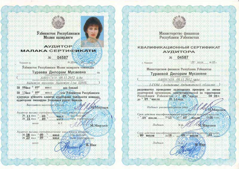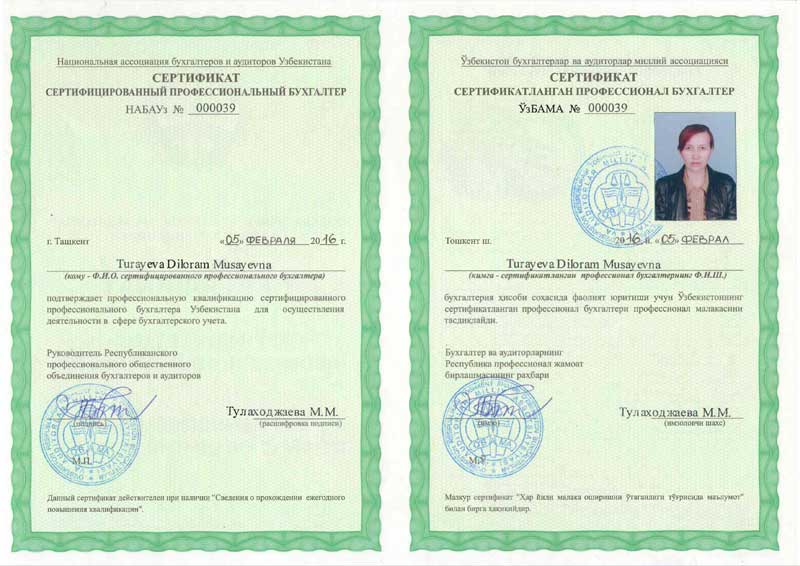 Высшее, ташкентский Государственный Экономический Университет, специализация –экономика, работа в качестве бухгалтера, аудитора. Общий стаж работы 27 лет, в качестве аудитора 14 лет. Член палаты аудиторов ,Член Ассоциации Бухгалтеров и Аудиторов Узбекистана.